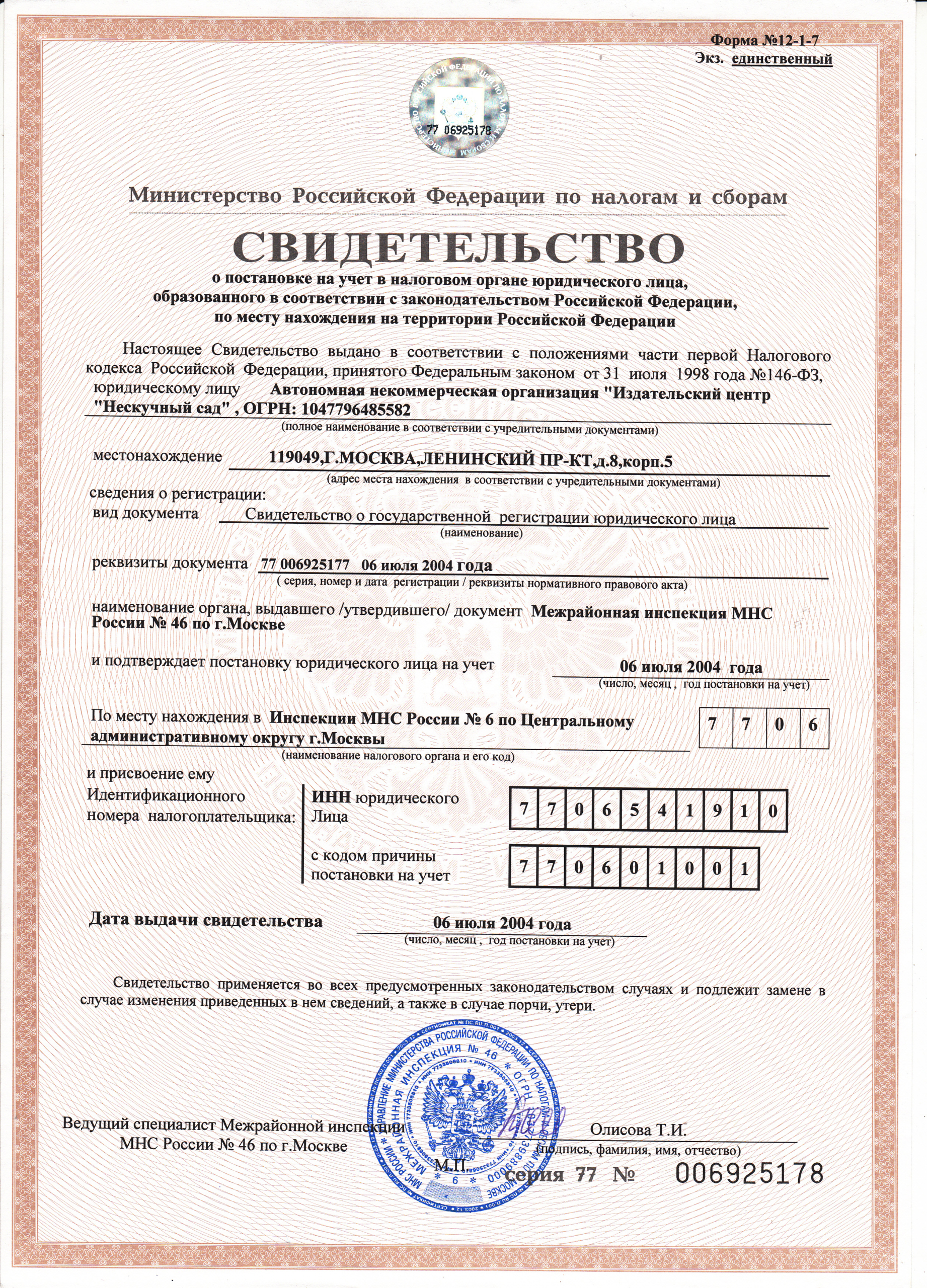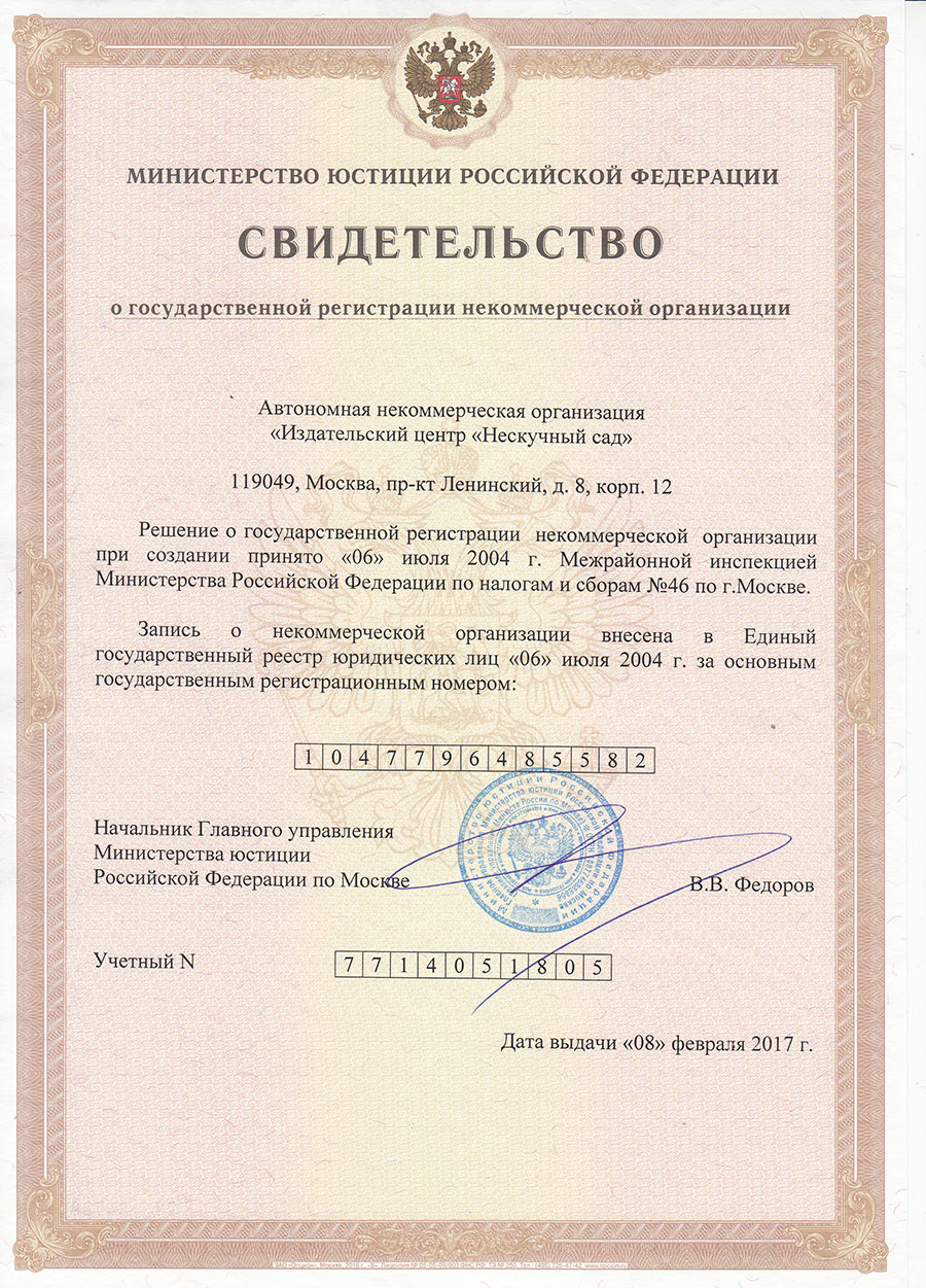 Уставные документы Автономной некоммерческой организации «Издательский центр «Нескучный сад»